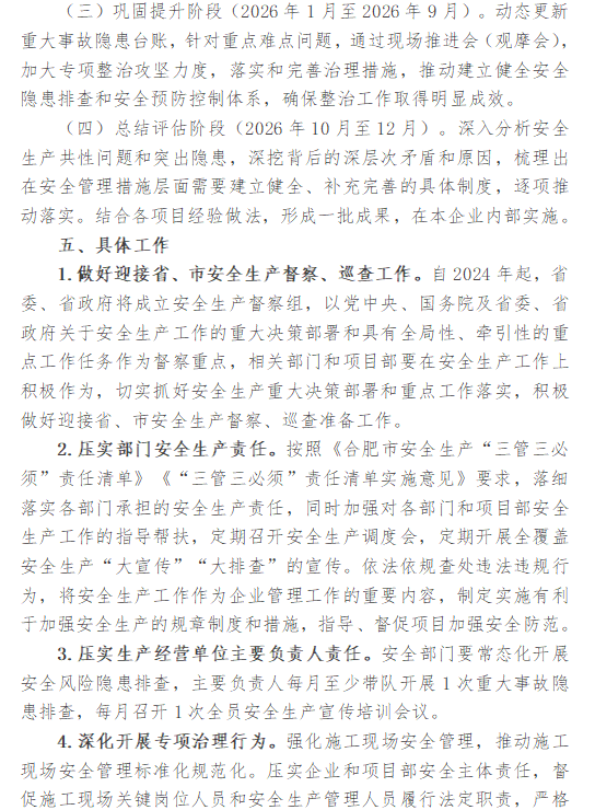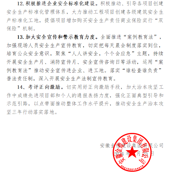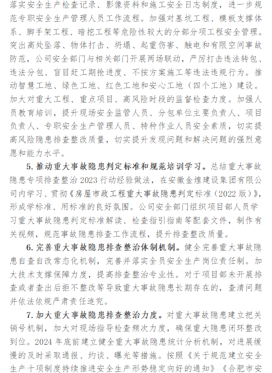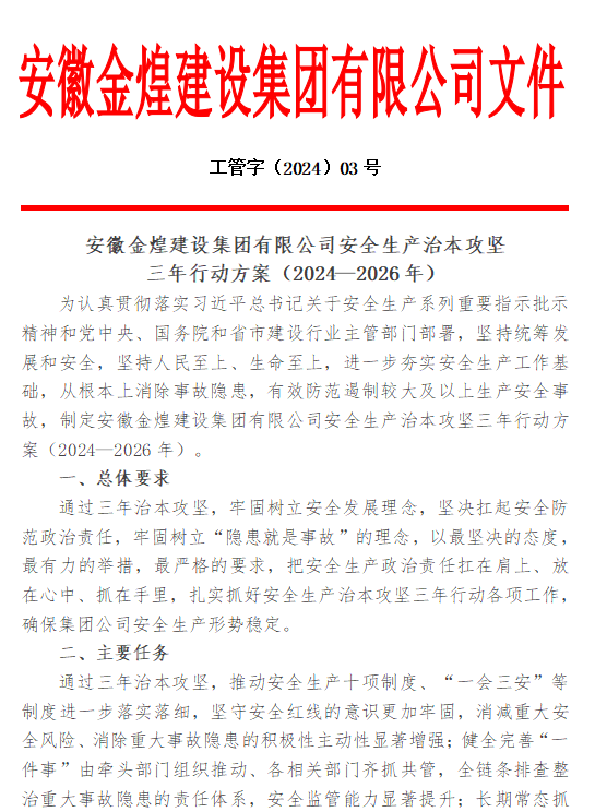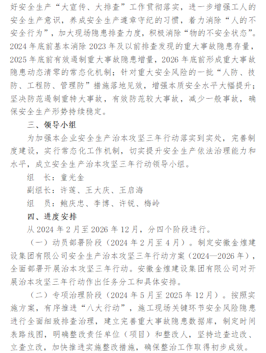 安徽金煌建设集团有限公司安全生产治本攻坚三年行动方案(2024—2026年)
