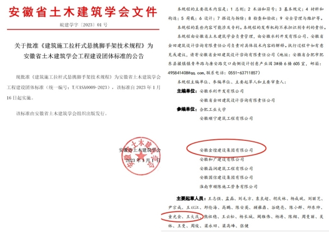 同时,金煌集团参与编写的《建筑施工拉杆式悬挑脚手架技术规程》作为安徽省土木建筑学会工程建设团体标准,该规程涵盖了拉杆式悬挑脚手架的设计、制作、安装、使用、检查和维护等多个环节,确保每一个环节都符合相关标准和要求。通过规程的实施,可以有效减少施工过程中的安全隐患,提高脚手架的稳定性和承载能力,从而保障施工人员的生命安全。它不仅能够为安徽省内的施工单位提供技术依据,还可能对全国范围内的拉杆式悬挑脚手架施工产生积极影响。