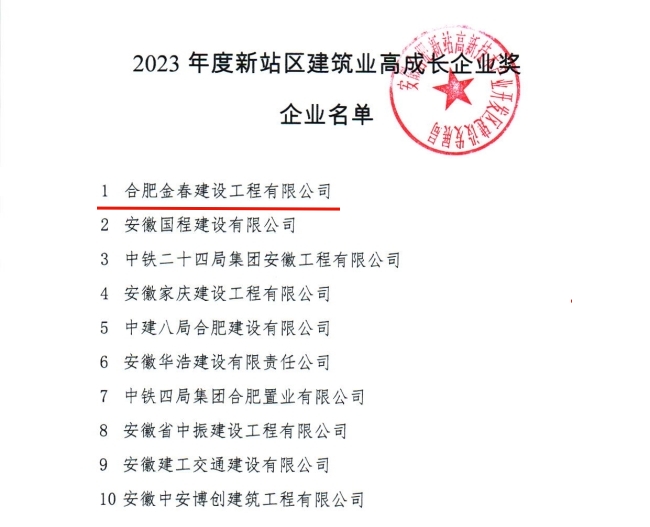 近日,从合肥新站区建发局获悉,金煌集团在新站区的全资子公司金春建设荣获合肥新站区2023年建筑业高成长型优秀企业称号。这一殊荣不仅是对金春建设过去一年在建筑业领域所取得成绩的高度认可,更是对其未来发展的殷切期许。