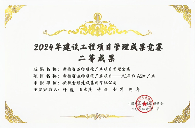为深入贯彻党的二十届三中全会精神,总结推广建设工程项目管理先进经验,引领企业不断推进项目管理创新,提升企业核心竞争力,中国施工企业管理协会举办的第二届项目管理成果交流会在星城长沙举行。由安徽金煌建设集团有限公司申报的奔图智造标准化厂房项目管理实践案例,荣获中国施工企业管理协会项目管理成果竞赛二等成果奖。