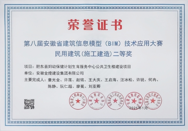 发展新质生产力助推建筑质量高发展,运用BIM技术提升建筑产业数字技术新水平。近期,由安徽省工程勘察设计协会、安徽省建筑业协会等5家协会联合举办的“第八届建筑信息模型(BIM)技术应用大赛”的最终评审结果正式公布。在这场新型数字技术大赛角逐中,金煌集团申报的“肥东县妇幼保健计划生育服务中心公共卫生楼建设项目”运用的BIM技术在此次大赛中荣获二等奖的的优异成绩。这一荣誉彰显了金煌集团在建筑行业创新运用能力的卓越实力。