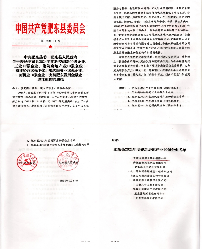 会上,县委副书记陈涛同志宣读了中共肥东县委、肥东县人民政府关于表彰2024年度科技创新10强企业、工业10强企业、建筑房地产业10强企业、农业经营10强主体、现代服务业10强企业、商贸业10强企业、支持肥东发展金融业10佳机构的通报。金煌集团一如既往,抢占行业表彰的榜首。受表彰的企业代表依次上台受奖。