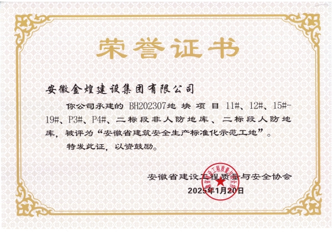 荣誉的获得是激励,更是责任。金煌集团将以此次获奖为契机,珍惜荣誉,再接再厉,持续加强安全生产标准化建设,不断提升安全生产管理水平,为打造精品工程、平安工程贡献力量,为安徽省建筑业高质量发展做出更新、更大的贡献!