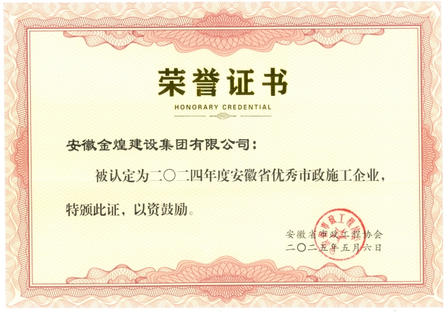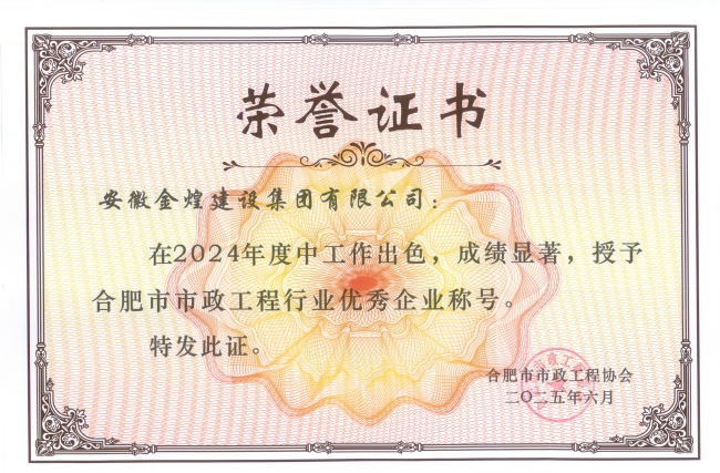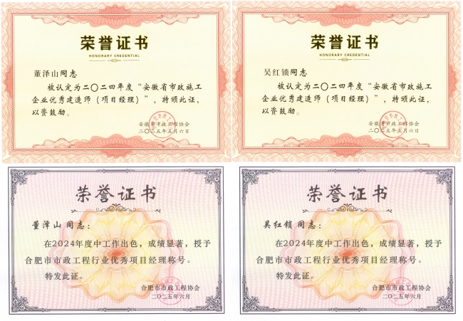 近日,从安徽省市政工程协会和合肥市市政工程协会传来喜讯,金煌集团凭借在市政工程领域的卓越表现,荣获2024年度安徽省优秀市政企业和合肥市优秀市政企业称号。同时,集团旗下的董泽山、吴红锁两位同志,凭借丰富的项目管理经验和出色的领导能力,被评为安徽省和合肥市市政施工企业优秀项目经理。