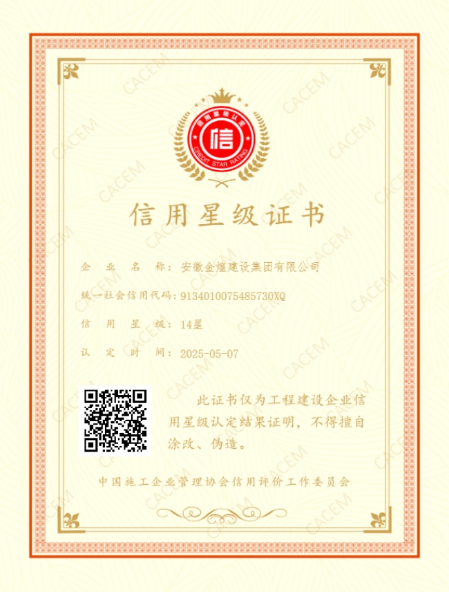信用星级管理是中国施工企业管理协会信用评价工作委员会对企业信用记录实行的星级认定和管理,目的是加快建立工程建设企业信用记录,健全信用星级的管理机制。该评价全面考量企业的经营能力、获利能力、偿债能力、履约情况、发展前景以及内部控制、信用风险状况等多个维度,为市场提供了一份客观、全面的企业信用画像。信用星级每年认定一次,星级评定的高低能有效反映企业的信用管理水平、履约行为等。此次金煌集团荣膺14星级认定,意味着其在信用程度、经营状况和履约能力等方面均达到了行业拔尖水平,彰显出强大的市场竞争能力和值得信赖的企业形象。