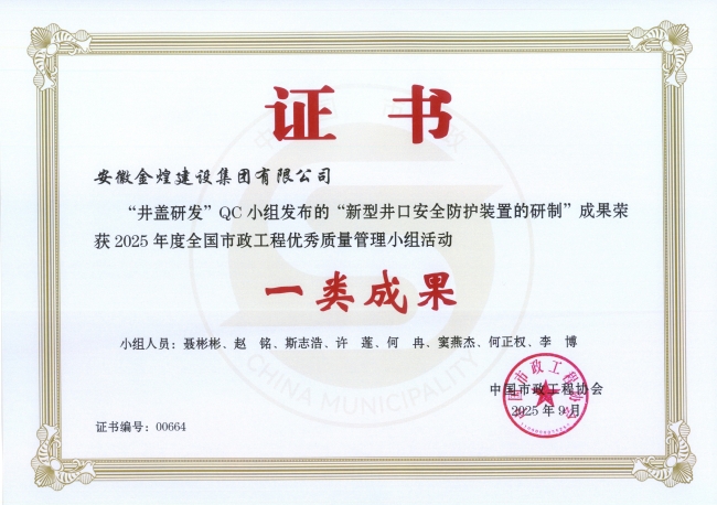 近日,中国市政工程协会公布了2025年度全国市政工程优秀质量管理小组名单,金煌集团再获殊荣,申报的《新型井口安全防护装置的研制》课题荣获全国市政优秀QC小组一类成果。此项荣誉充分彰显了金煌集团在市政工程建设领域精益求精的质量管理水平,也印证了公司在技术创新与质量管控方面的核心竞争力。