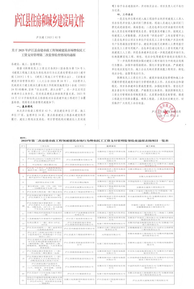 近日,庐江县住房和城乡建设局发布《关于2025年庐江县房建市政工程领域建筑市场暨农民工工资支付管理第二次监督检查情况的通报》(庐住建[2025]82号),安徽金煌建设集团作为牵头单位,参与建设的“庐江县‘十四五’县城新型城镇化提质升级一期项目—商贸科技学校项目”凭借规范的建筑市场管理、扎实的农民工工资支付保障工作,再次入选通报表扬名单,成为全县房建市政工程领域规范履约、保障务工人员权益的典型代表。
