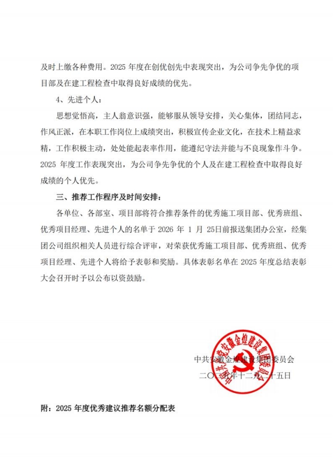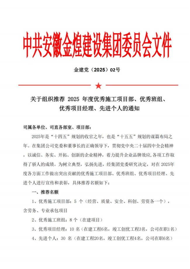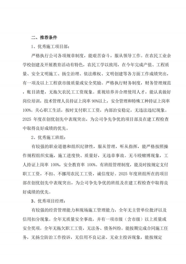 关于组织推荐 2025年度优秀施工项目部、优秀班组、 优秀项目经理、先进个人的通知