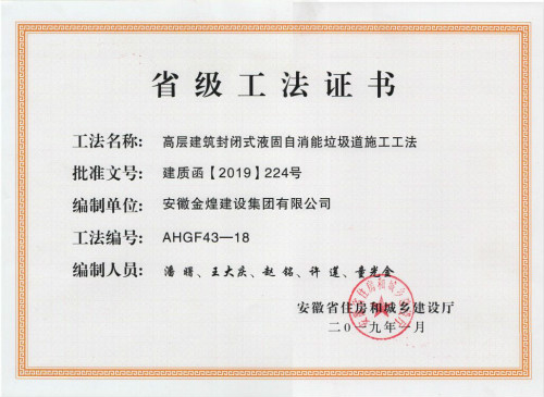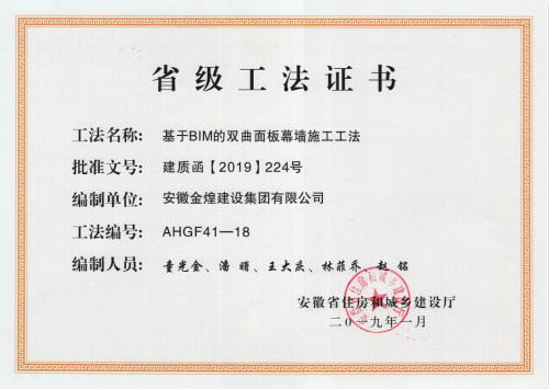 近日,安徽省住房和城乡建设厅颁发了2018年度安徽省省级工法证书。安徽金煌建设集团共获得了《基于BIM的双曲面板幕墙施工工法》《风管内衬吸音橡塑棉消声施工工法》《高层建筑封闭式液固自消能垃圾道施工工法》3项工法。