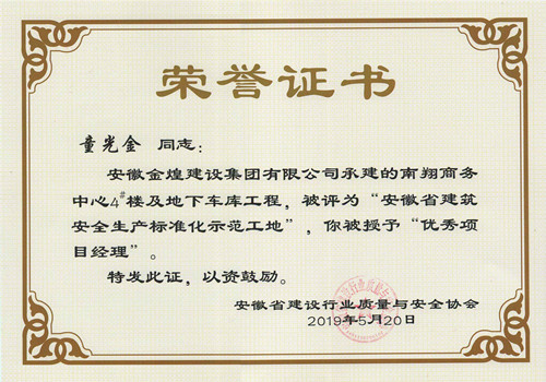 由安徽金煌建设集团总承包施工的南翔商务中心4#楼及地下车库项目日前经省、市专家组验收评定安徽省建筑安全生产标准化示范工地。