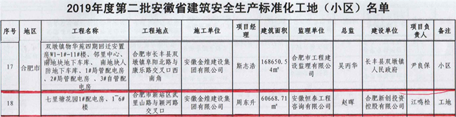 日前,安徽金煌建设集团有限公司承建的七里塘花园1#配电房、1#-6#楼工程和双墩镇物华苑四期回迁安置房W1-1#-11#楼、邻里中心、南地块地下车库、南地块人防地下车库、1#-3#局管配电房工程相继获评“安徽省建筑安全生产标准化示范工地(小区)”。