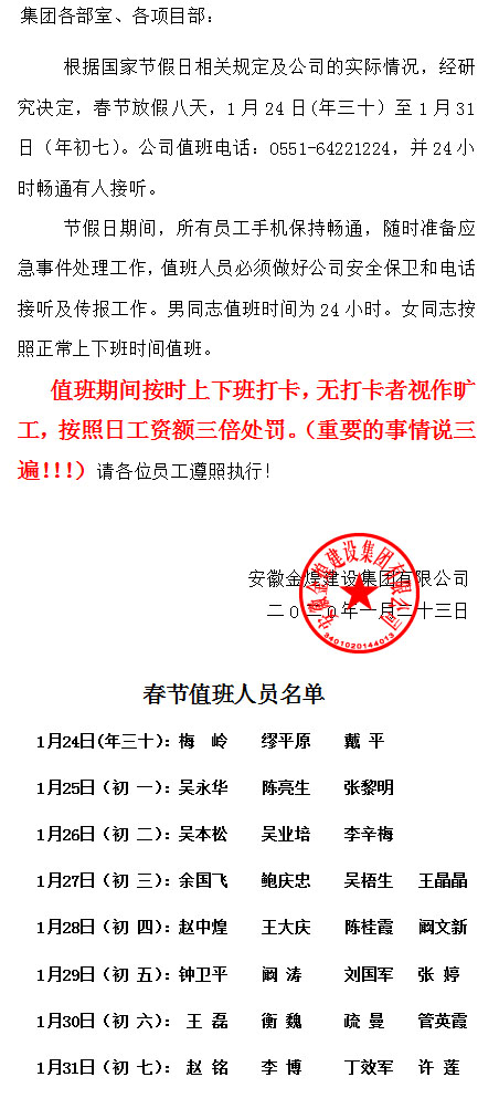 2020年度春节放假通知