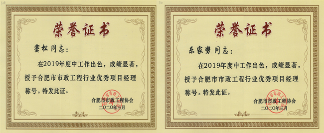 近日,从合肥市市政工程协会获悉,金煌集团荣获2019年度“合肥市市政工程行业优秀企业称号,乐家努、窦松两位同志被授予合肥市市政工程行业优秀项目经理称号。