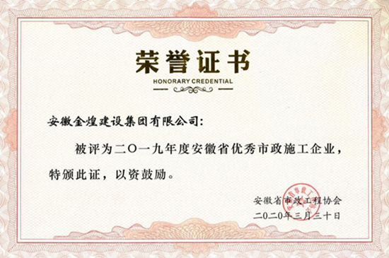 金煌集团荣获2019年度安徽省优秀市政施工企业等荣誉