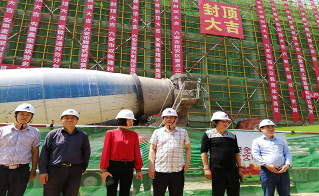 “安得校舍千万间,大庇学子俱欢颜”。5月2日上午10时58分,六安市裕安区清溪路小学建设项目现场条幅高悬、彩旗飘扬,伴随着最后一方混凝土浇筑到位,该工程主体结构喜封金顶。裕安区教育局局长张恩平、裕安区重点局局长林泽文、省人大代表城北小学党总支书记高兰等相关领导到场见证并祝贺这一激动人心的时刻。安徽金煌建设集团总经理吴永华应邀参加封顶仪式。