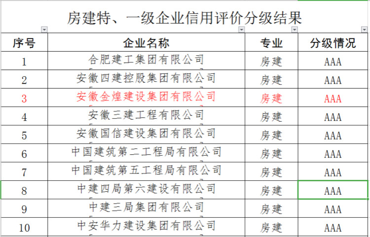 金煌集团荣获2020年(第一次)合肥市施工总承包企业信用综合评价AAA级称号