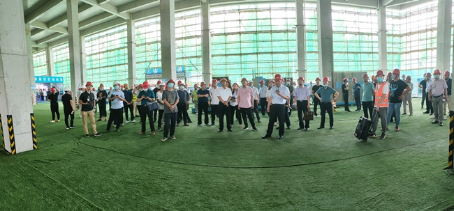 2020年7月7日下午15时,在阜阳市住房城乡建设局党组书记、局长海阔的带领下,由各县(市)、区住房和城乡建设局,阜阳经开区自然资源和建设管理局、阜合现代产业园区规划建设局,城南新区建设处,驻阜房建和市政二级及以上施工总承包企业,驻阜监理企业,阜城在建工程建设单位、施工单位、监理单位等200余人组成的全市建筑质量安全观摩团走进阜阳颍淮农商行项目进行观摩。安徽晶宫控股集团副总裁吴燕信、安徽金煌建设集团总经理吴永华等陪同观摩。