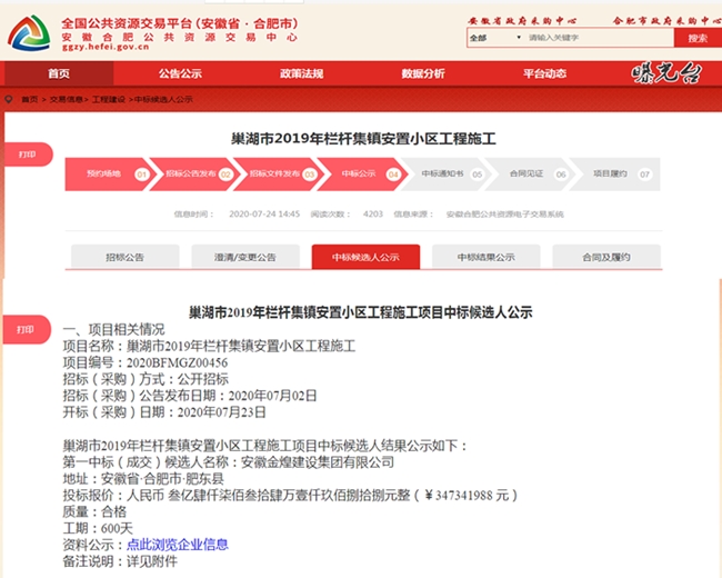 喜讯:金煌集团中标巢湖市2019 年栏杆集镇安置小区工程