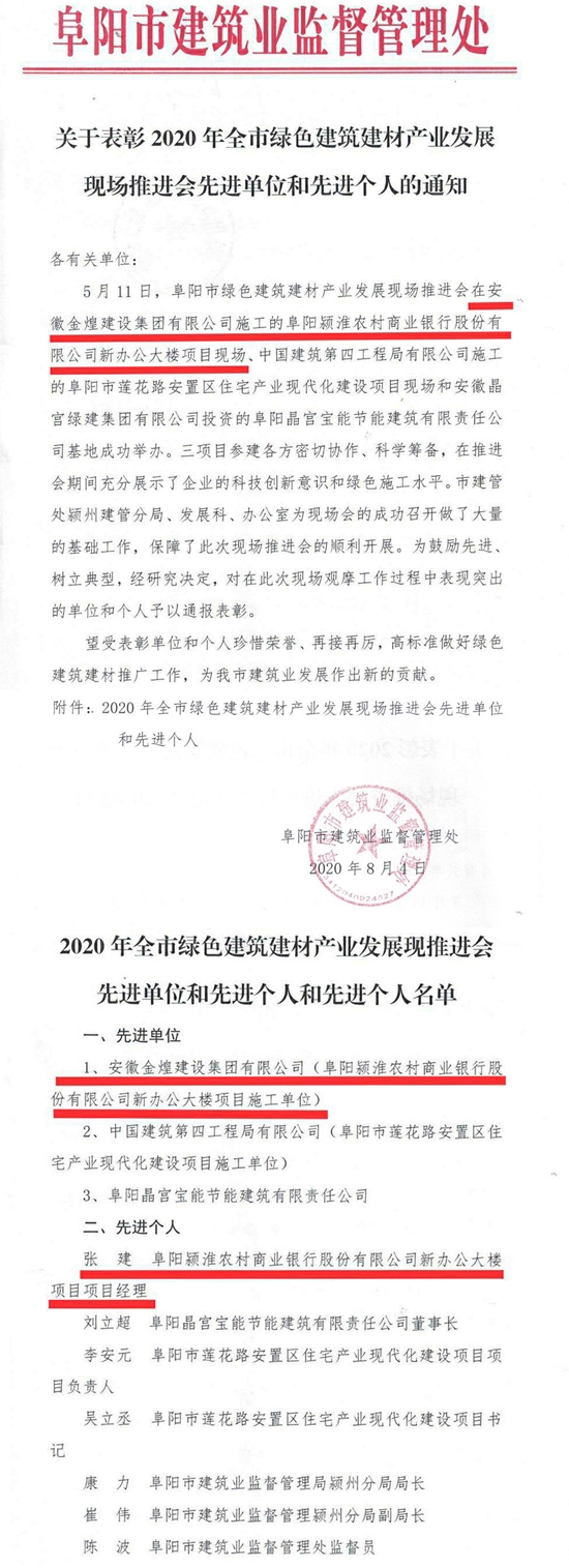 金煌集团承建的阜阳颍淮农商行新办公楼项目在2020年阜阳市绿色建筑建材产业发展现场推进会中充分展示企业的科技创新意识和绿色施工水平,并在现场观摩工作过程中表现突出,受阜阳市建筑业监督管理处表彰,获得先进单位和先进个人的荣誉。