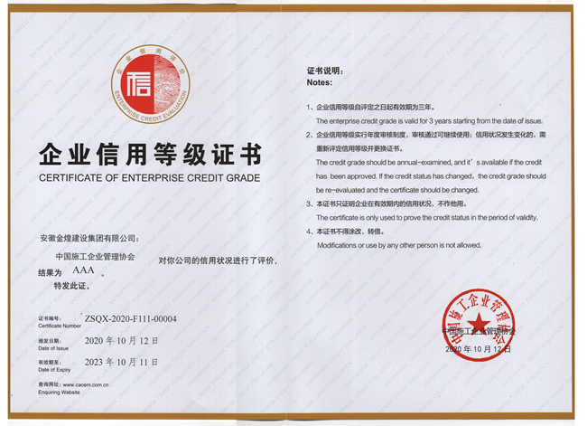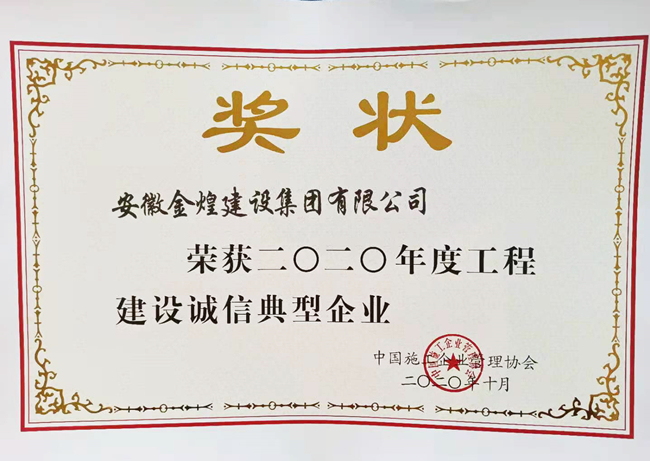 2020年度工程建设诚信企业推介会在绿城南宁召开,安徽金煌建设集团凭借良好的生产经营业绩、健全的管理体系以及诚信建设方面的丰硕成果,连续7年保持AAA级信用称号,继续保持工程建设行业诚信典型企业称号,被中国施工企业管理协会核定为9星等级企业。