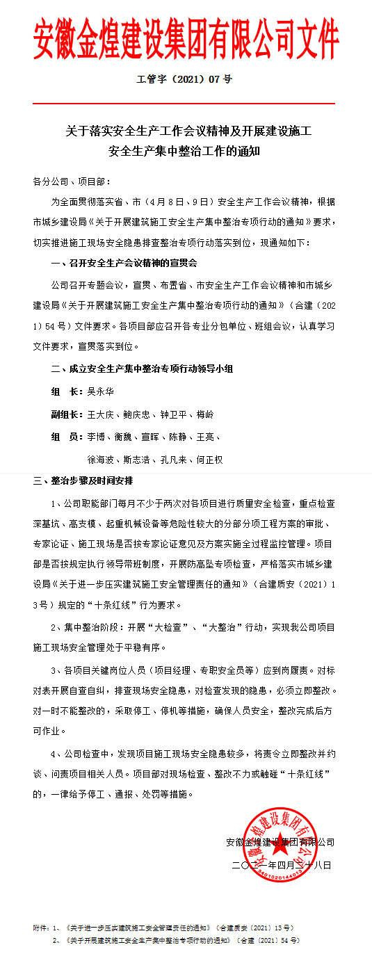 关于落实安全生产工作会议精神及开展建设施工安全生产集中整治工作的通知