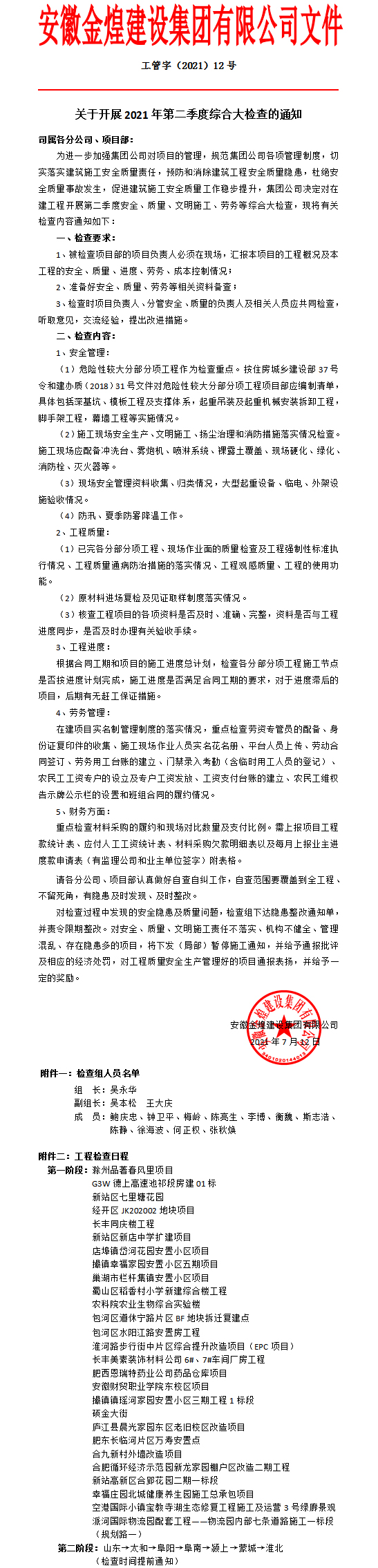 关于开展2021年第二季度综合大检查的通知