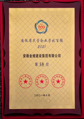 10月21日上午,由安徽省发展民营经济领导小组主办,省工商联、省经信厅、省市场监督管理局共同承办的2021年度安徽省民营企业百强发布会在阜阳市隆重召开。安徽金煌建设集团列居民企百强第58位,这是金煌集团首次参加安徽民企百强排序。安徽金煌建设集团总经理吴永华同志应邀参加授牌仪式。