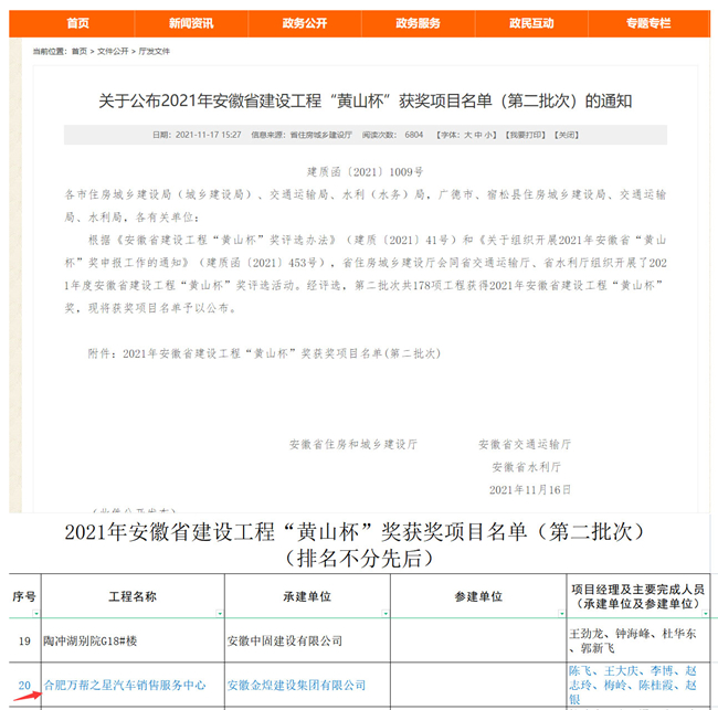 近日,从安徽省住房和城乡建设厅公布的2021年安徽省建设工程“黄山杯”获奖项目名单(第二批次)的通知中获悉,金煌集团承建的合肥万帮之星汽车销售服务中心工程荣获安徽省建设工程“黄山杯”奖(省优质工程)。