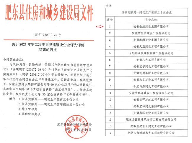 为表扬典型,鼓励先进,依据合肥市建筑市场信用管理办法(合建建管【2017】29号)和肥东县建筑业企业评优评先实施工作方案(建字【2021】20号)等文件精神,金煌集团在肥东县住房和城乡建设局表彰的2021年度第二次评选中荣获“经济贡献奖”和“其他特殊奖项”。