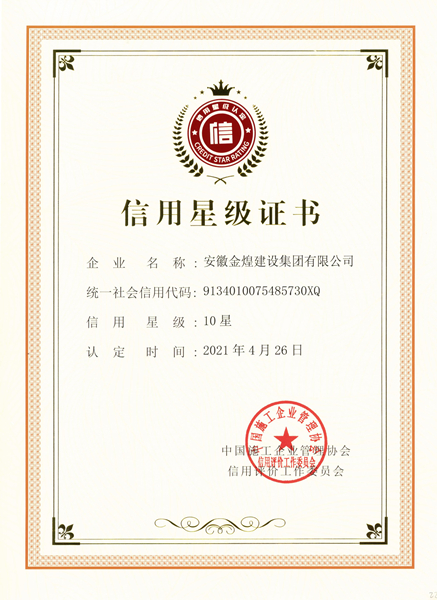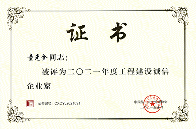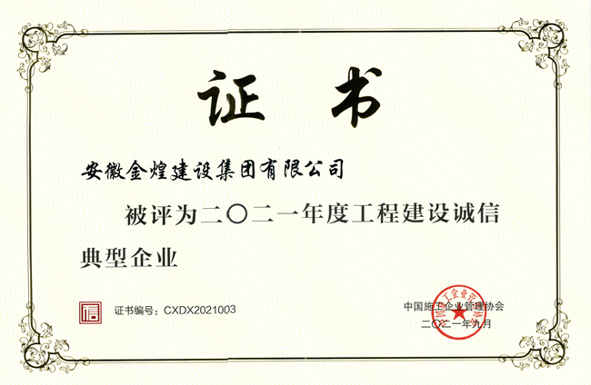 2021年是“十四五”开局之年,金煌集团在各级政府和行业主管单位的亲切关怀和指导下,各项工作取得了骄人的成绩。在连续八年保持全国建设行业AAA信用评价等级的基础上,荣获2021年度全国诚信典型企业,被中国施工企业管理协会认定为10星级信用单位。党委书记、董事长童光金先生被授予全国诚信企业家称号。