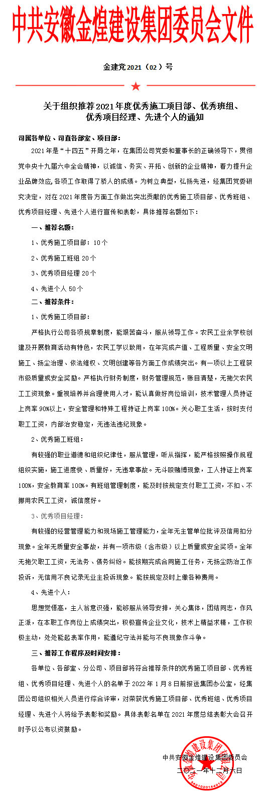 关于组织推荐2021年度优秀施工项目部、优秀班组、 优秀项目经理、先进个人的通知