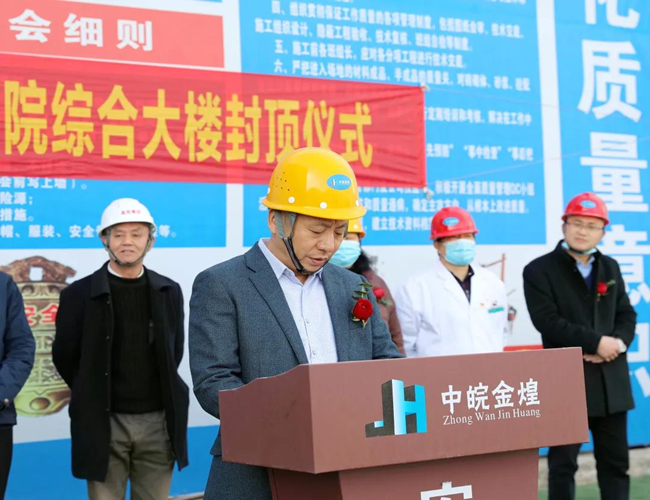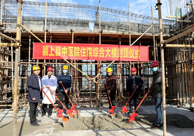 颍上县中医院党总支书记、院长刘立广出席封顶仪式并讲话。各方责任单位代表共120余人参加封顶仪式,共同见证这激动人心的时刻,封顶仪式由副院长任世龙主持。仪式上,颍上县中医院新住院综合楼项目负责人、县中医院院长助理沈续林作表态发言;颍上县中医院党总支书记、院长刘立广,安徽金煌建设集团有限公司项目总负责人吴和生分别为本次封顶仪式致辞;随后,参加仪式的领导共同挥锹为县中医院新住院综合楼工程结构封顶浇灌最后一方混凝土,标志着新住院综合楼顺利封顶。