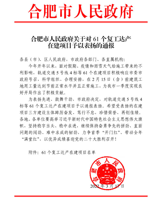 近日,从合肥市人民政府印发了《关于对61个复工达产在建项目予以表扬的通报》文件中获悉,安徽金煌建设集团承建的肥东店埠镇岱河花园安置小区建设项目受合肥市人民政府表彰。努力克服春节假期、新冠疫情和雨雪天气给施工带来的多种不利影响,采取有效措施,科学高效地组织人员推动项目复工达产,在行业内起到模范带头作用。在举国疫情防控期间,金煌集团成立了疫情防控领导工作小组,明确责任分工,细化职责内容,在公司多次的复工复产工作视频会议上积极听取公司领导的安排部署,不仅要在工期节点方面领先,还要在信誉质量方面领跑,疫情面前更要彰显责任担当。