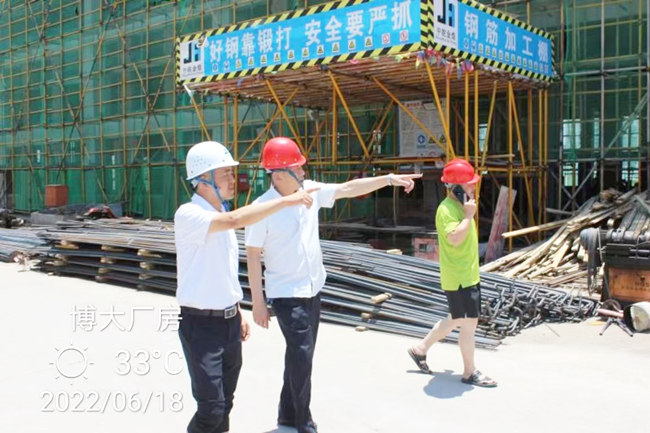 吴总对项目的工程进度,文明施工给予充分的肯定,同时对项目安全管理、疫情防控存在的不足提出几点要求:1、加强门禁管理,落实实名制管控,做好务工人员筛选及安全教育培训工作,务必做到一人一档。2、以项目争创“安全文明标准化工地”为窗口期,全面提升项目安全文明形象,消除安全隐患,加强标准化管理,合理规划场地,为工友提供和谐、安全的工作环境。3、深入开展全国第二十一个安全生产月活动,紧扣“遵守安全生产法,当好第一责任人”活动主题,广泛动员,切实做好安全生产管理工作,做到警钟长鸣。