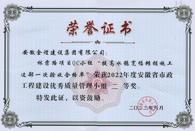2022年6月28日至29日,2022年度安徽省暨合肥市市政工程建设优秀QC小组成果交流会在合肥举行。安徽金煌建设集团选派市政一级建造师聂彬彬同志参赛,他交流发布的《提高水稳宽幅摊铺施工边部一次验收合格率》成果荣获安徽省市政工程QC小组成果二等奖,这也是金煌集团首次参加市政工程专业QC交流活动。