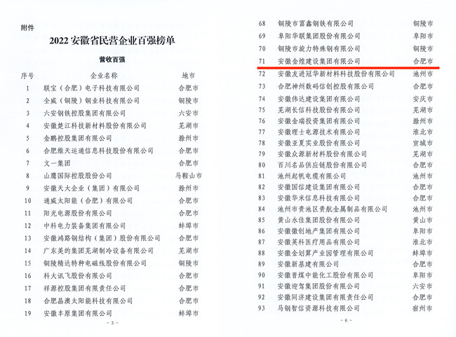 近日,2022年世界制造业大会—中国民营制造业合作交流对接会在合肥举行,现场发布2022年安徽省民营企业百强调研分析报告。报告显示,2021年,面对复杂严峻的形势,安徽省民营经济展现了强大的发展活力和韧性。民营百强企业作为安徽民营企业发展和科技创新的“主力军”,规模实力整体增强,运行效益总体回升,吸纳就业趋于平稳,税收贡献进一步加大,产业结构进一步优化,自主创新能力不断增强,取得了来之不易的成绩,对促进安徽经济和社会发展发挥了积极作用。安徽金煌建设集团有限公司入榜2022年安徽民营百强企业行列,列居排行榜71位。