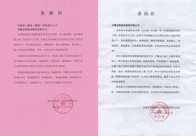 近日从建设单位获悉,我公司承建的肥东经开区关井路、西山驿南路、杨店路项目和合肥东部新城亲水路(山水路—日出路)两个在建项目分别获得建设单位的表扬信。
