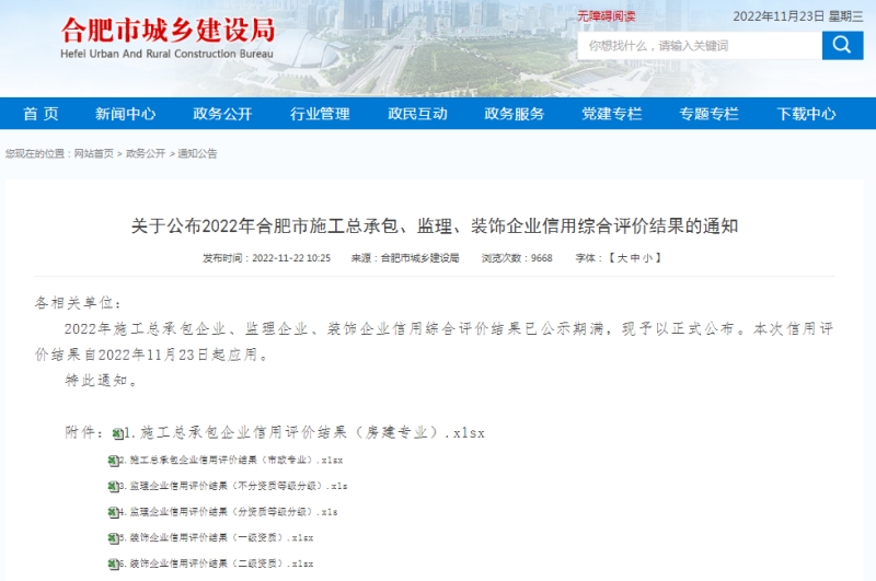 近日,合肥市城乡建设局网站发布关于公布2022年合肥市施工总承包、监理、装饰企业信用综合评价结果的通知中获悉,金煌集团继续保持合肥市建设局建筑市政装饰三个专业AAA评价称号。