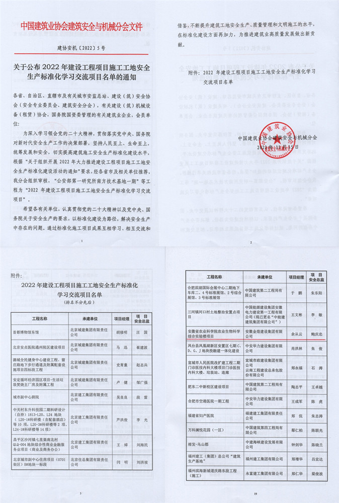 近日,从中国建筑业协会建筑安全与机械分会获悉,由安徽金煌建设集团承建的安徽省农业科学院农业生物科学综合实验楼项目荣获2022年度全国建设工程项目施工安全生产标准化工地。该奖项是全国安全文明施工的最高奖项,被业内誉为安全文明施工方面的“鲁班奖”。