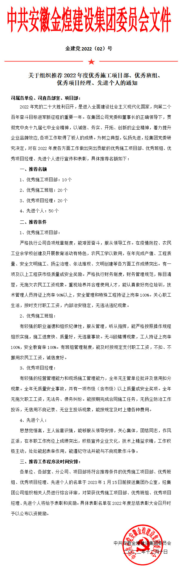 关于组织推荐2022年度优秀施工项目部、优秀班组、优秀项目经理、先进个人的通知