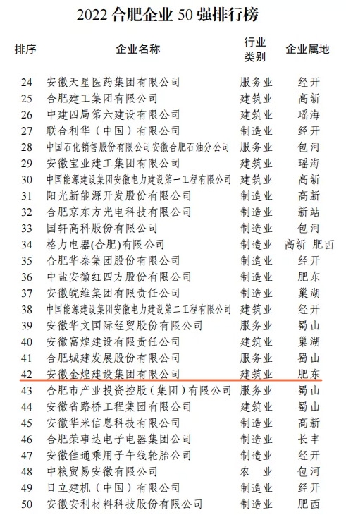 荣耀加冕 金煌集团荣膺2022安徽省百强企业、合肥企业50强、合肥建筑业企业20强