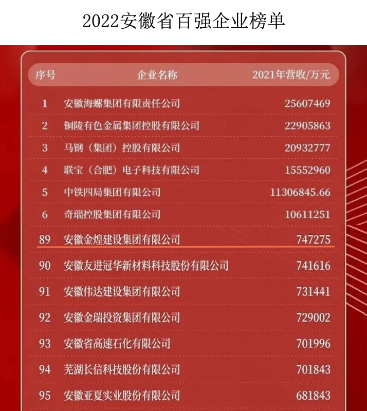 12月12日,省企业联合会、省企业家联合会连续第18次发布“2022安徽百强企业”“2022安徽制造业百强企业”“2022安徽服务业百强企业”榜单,金煌集团位列居89名。近日,从合肥市人民政府发布了“2022合肥企业50强排行榜”、“2022合肥建筑业企业20强排行榜”,分别位列居第42名和第9名。
