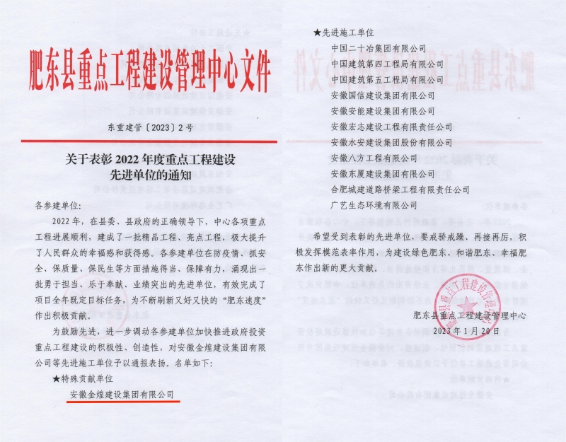 近日从合肥市肥东县重点工程建设管理中心公布的关于表彰2022年度重点工程建设先进单位通知中获悉,金煌集团荣获“特殊贡献单位”荣誉,也是获得该荣誉的唯一的建筑企业。