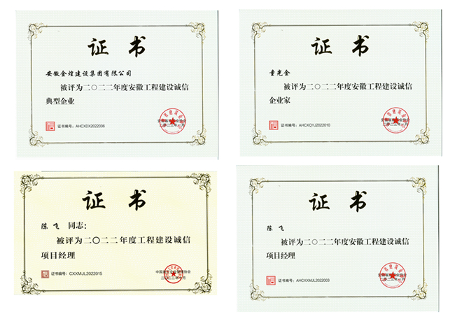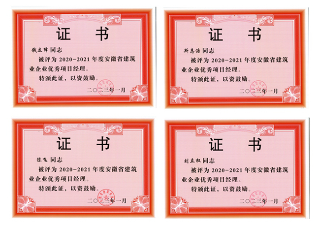 此次收获的荣誉有:荣获2022年度中国施工企业管理协会星级认定11星;中国施工企业管理协会工程建设诚信项目经理(陈飞),安徽省建筑业诚信企业家(童光金);安徽省建筑业诚信项目经理(陈飞)、2020-2021年度安徽省建筑业企业优秀项目经理(陈飞、刘立权、钱立绎、斯志浩)。继续保持中国施工企业管理协会信用评价AAA级、安徽工程建设企业信用AAA等级评价,安徽工程建设诚信典型企业称号。