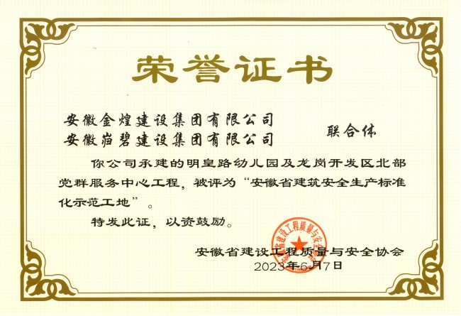 近日,从安徽省建设工程质量与安全协会公布2023年度第一批“安徽省建筑安全生产标准化工地”名单获悉,金煌集团承建的肥东县工人文化宫建设项目、明皇路幼儿园及龙岗开发区北部党群服务中心项目榜上有名,荣获2023年度第一批“安徽省建筑安全生产标准化工地”称号。