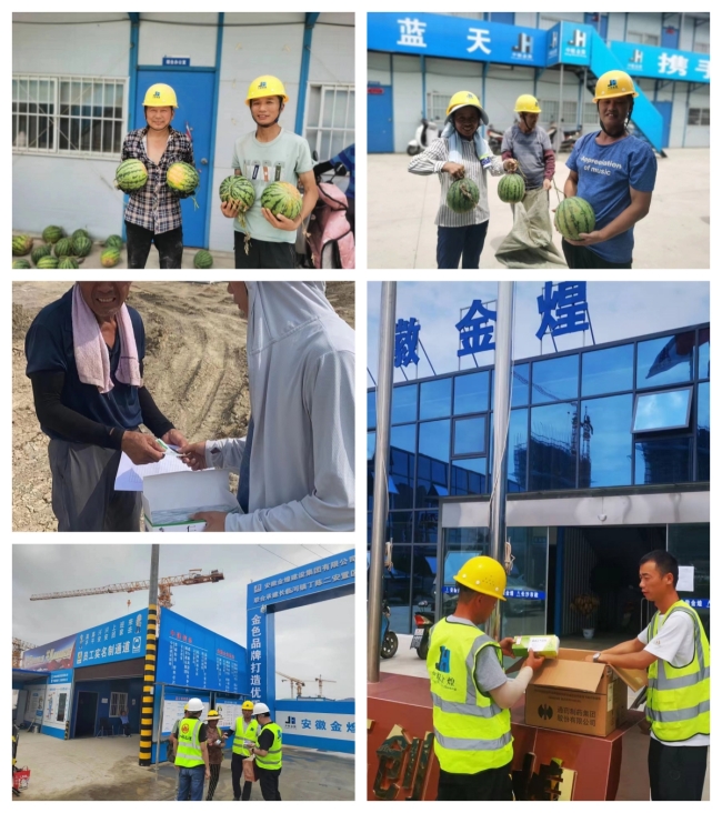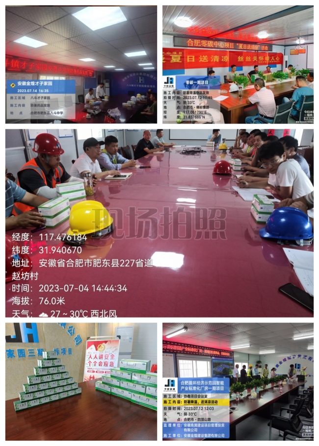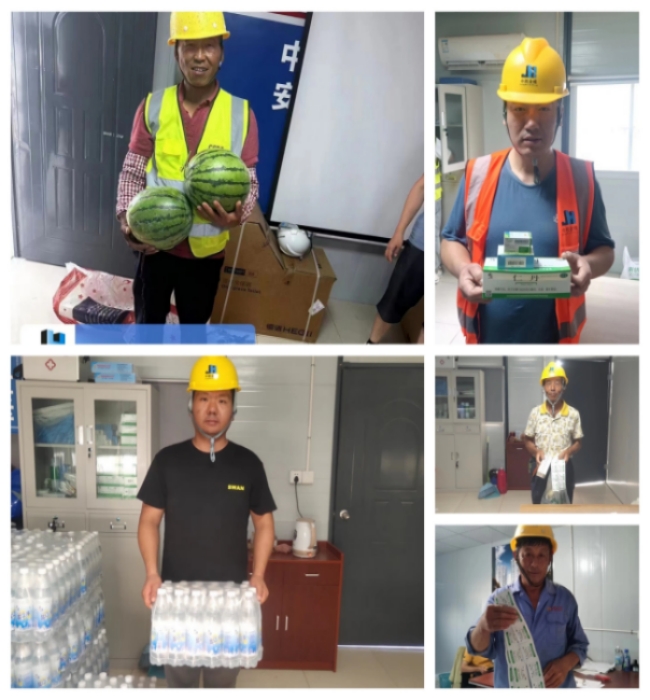 在合肥循坏经济示范园智能产业标准化厂房项目施工现场,300多名工人如火如荼奋战在施工现场的每一个角落。应对高温天气考验,项目部多措并举,向工友们送绿豆汤,配备直饮水机和凉茶桶,调整夏季高温作业的休息制度。食堂也会准备西瓜、绿豆汤,方便工友们在休息之余可以补充水分、预防中暑。项目部还制定了高温防暑应急预案,合理避开高温峰值时段,储备了担架、氧气袋等应急物资,保障工友们生命健康。