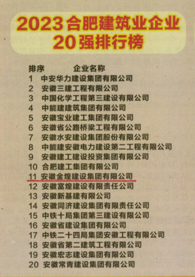 近日,从合肥市企业家联合会获悉,金煌集团再次荣登合肥建筑业企业20强称号,列居第11位。这也是金煌集团连续八年荣获此项殊荣。