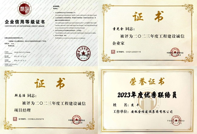 2014年是金煌集团首次向中国施工企业管理协会申请信用等级评估,至今一直保持AAA等级。除此之外,在诚信守约的历程中,公司先后荣获并保持中国建筑业协会AAA信用等级,中国市政工程协会AAA信用评价,安徽省建筑业协会AAA信用评价,中国施工企业协会诚信典型企业称号,安徽省建筑业协会诚信典型企业称号等荣誉。