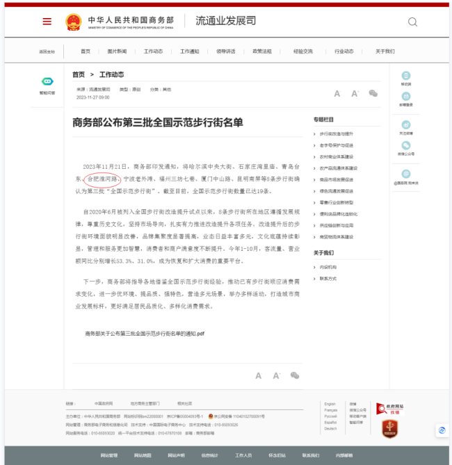 11月21日,商务部印发通知将合肥淮河路步行街确认为第三批“全国示范步行街”,这也是目前安徽省唯一的一条“全国示范步行街”,这是淮河路步行街继入选“中国著名商业街”、第一批国家级夜间文化和旅游消费集聚区、首批全国示范智慧商圈“中国美食旅游十街”后斩获的又一“国字号”殊荣。