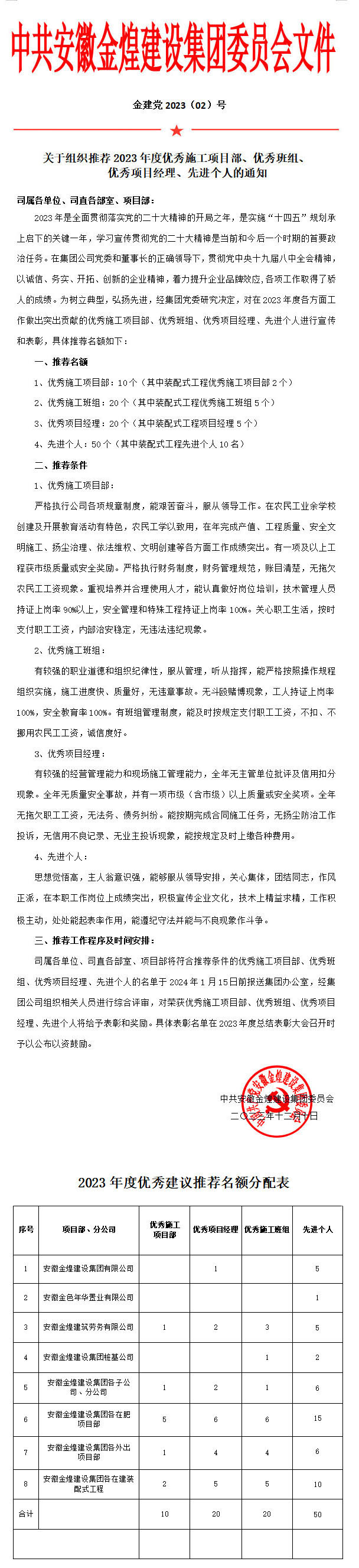关于组织推荐2023年度优秀施工项目部、优秀班组、 优秀项目经理、先进个人的通知